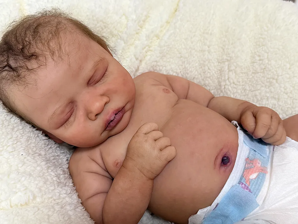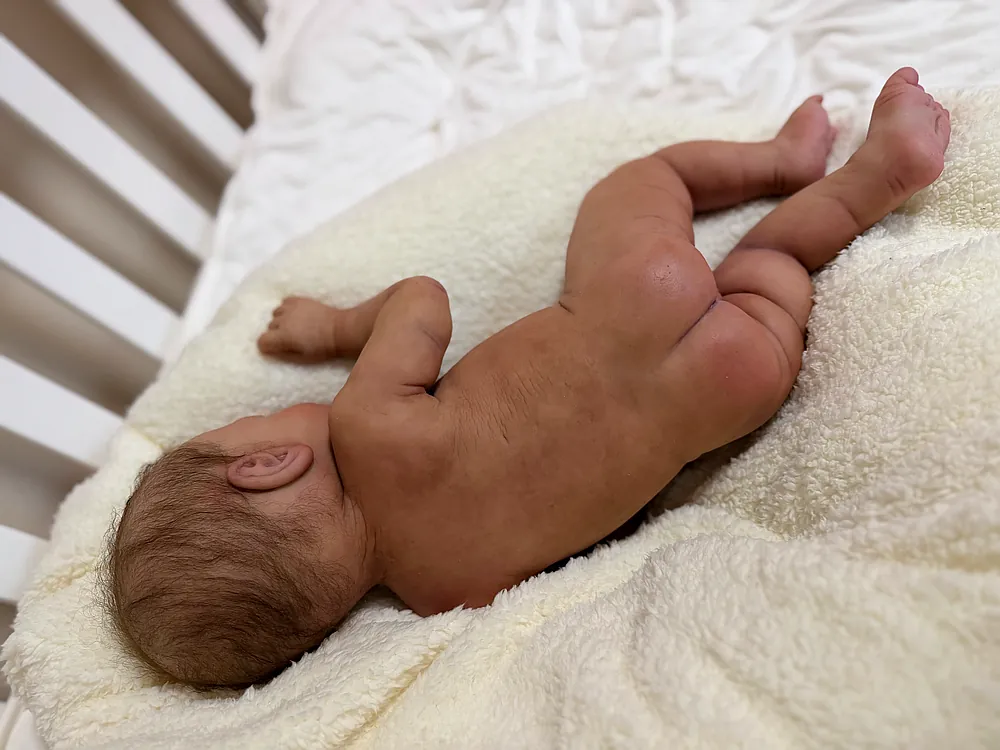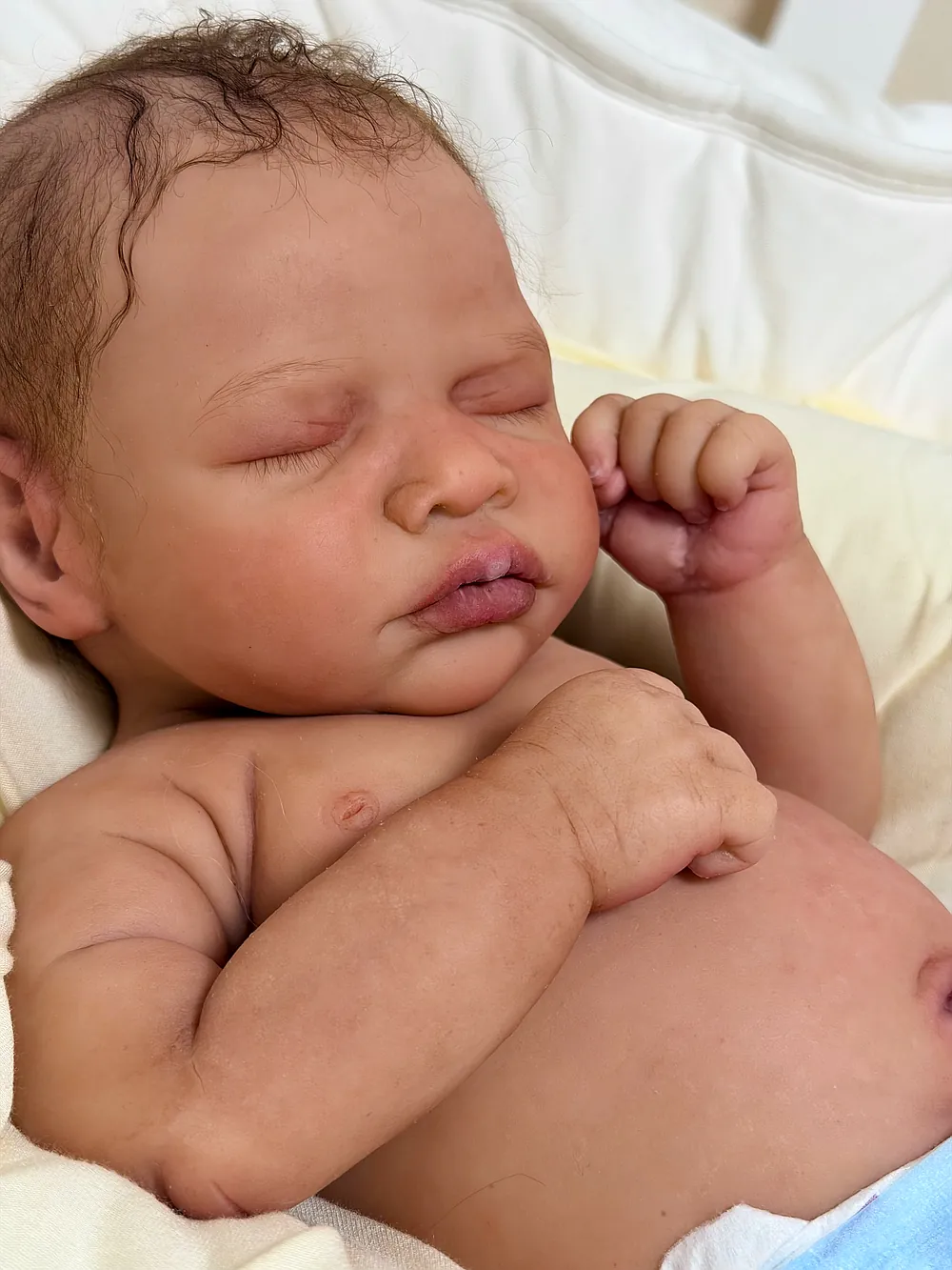 He has an open mouth (mouth is open, but not sculpted inside) that can take a pacifier, and soft armatures in his arms and legs. He is cast in eco20/slacker soft blend silicone and is soooo squishy. He is sealed and matted with silicone velvet matting powder, which makes him oh so soft! He feels like a real baby and just snuggles into you when you hold him. He has a gorgeous biracial skin tone and soft curly dark brown hair that is fun to brush and style. He fits into newborn and large preemie-sized clothing.