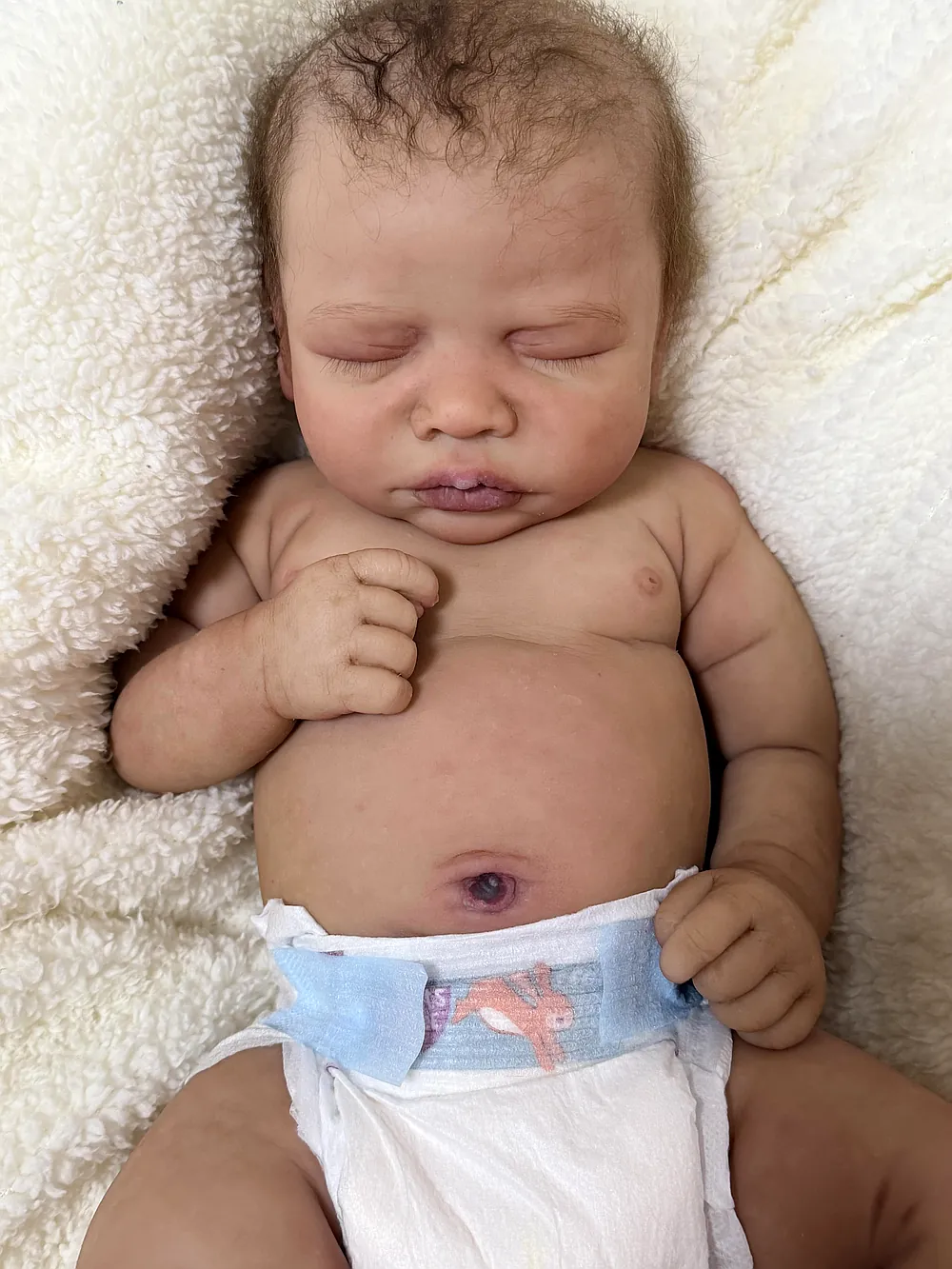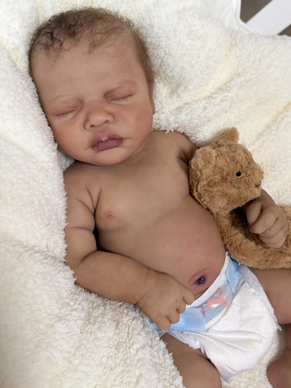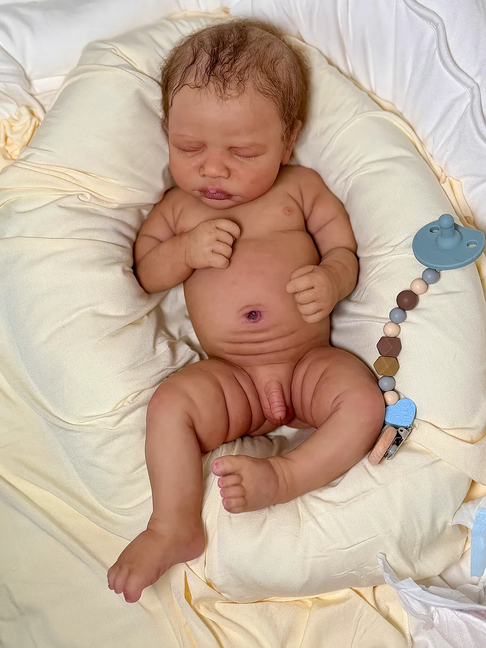 He has an open mouth (mouth is open, but not sculpted inside) that can take a pacifier, and soft armatures in his arms and legs. He is cast in eco20/slacker soft blend silicone and is soooo squishy. He is sealed and matted with silicone velvet matting powder, which makes him oh so soft! He feels like a real baby and just snuggles into you when you hold him. He has a gorgeous biracial skin tone and soft curly dark brown hair that is fun to brush and style. He fits into newborn and large preemie-sized clothing.