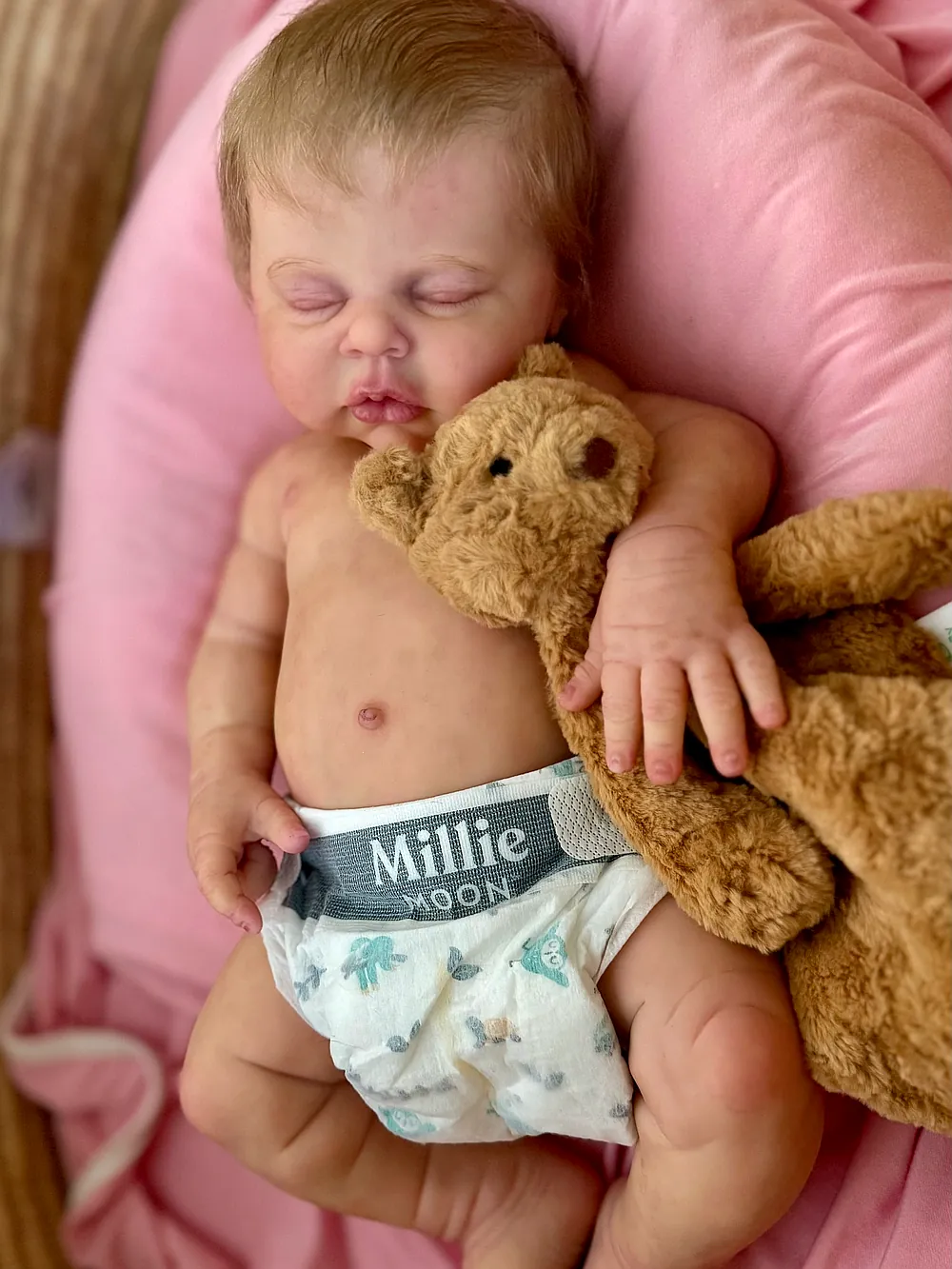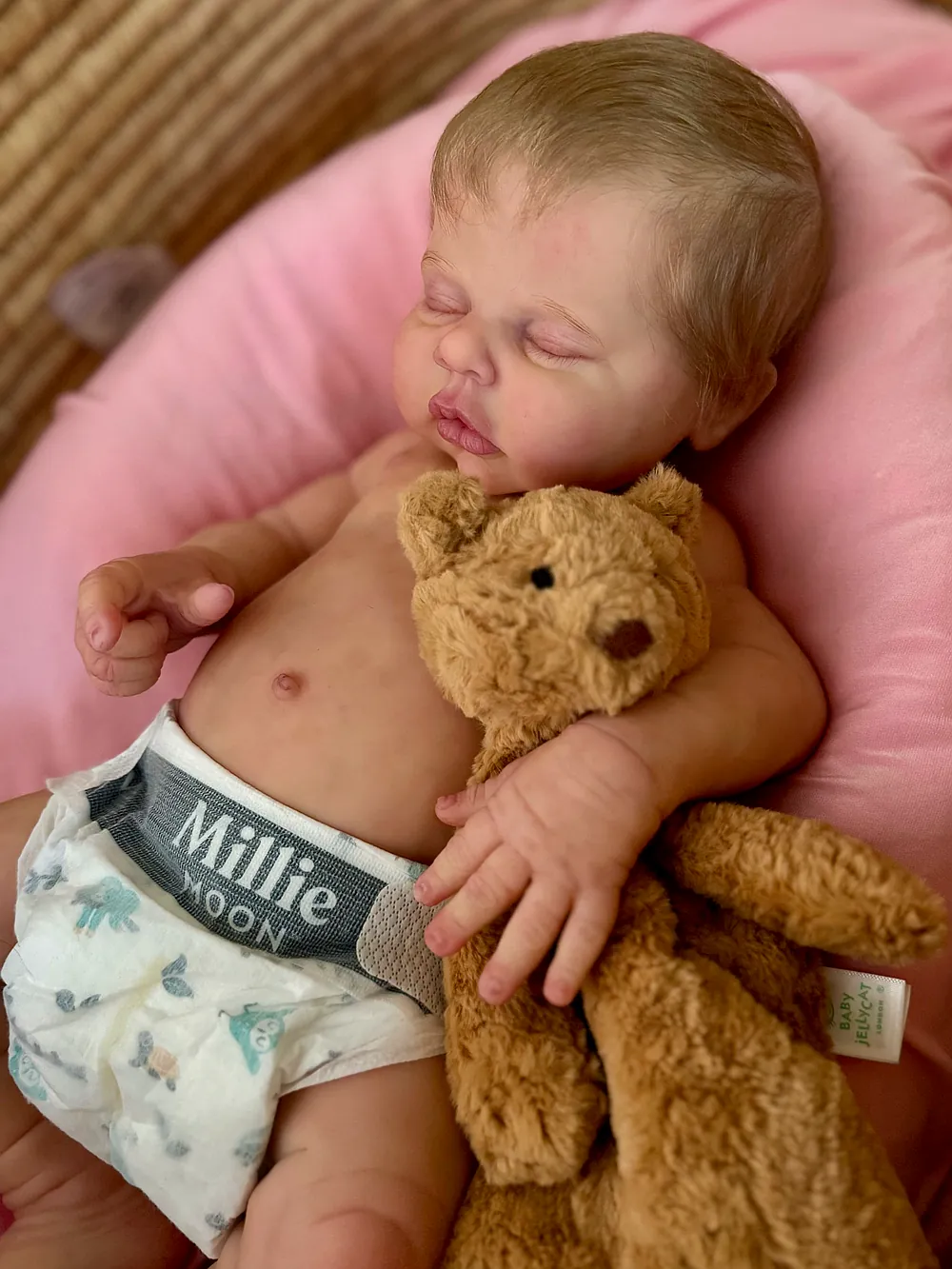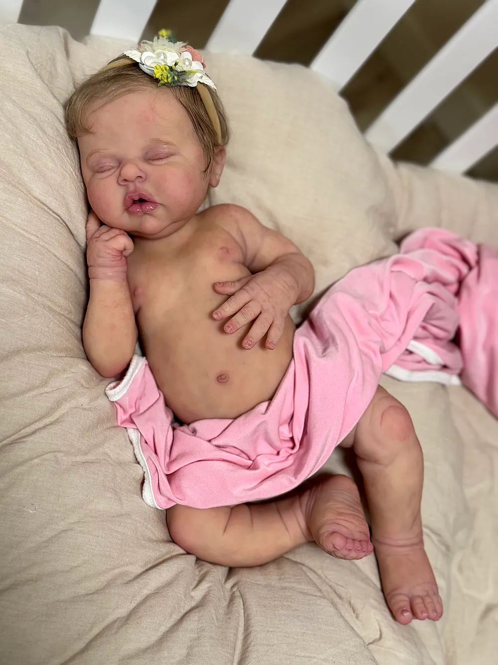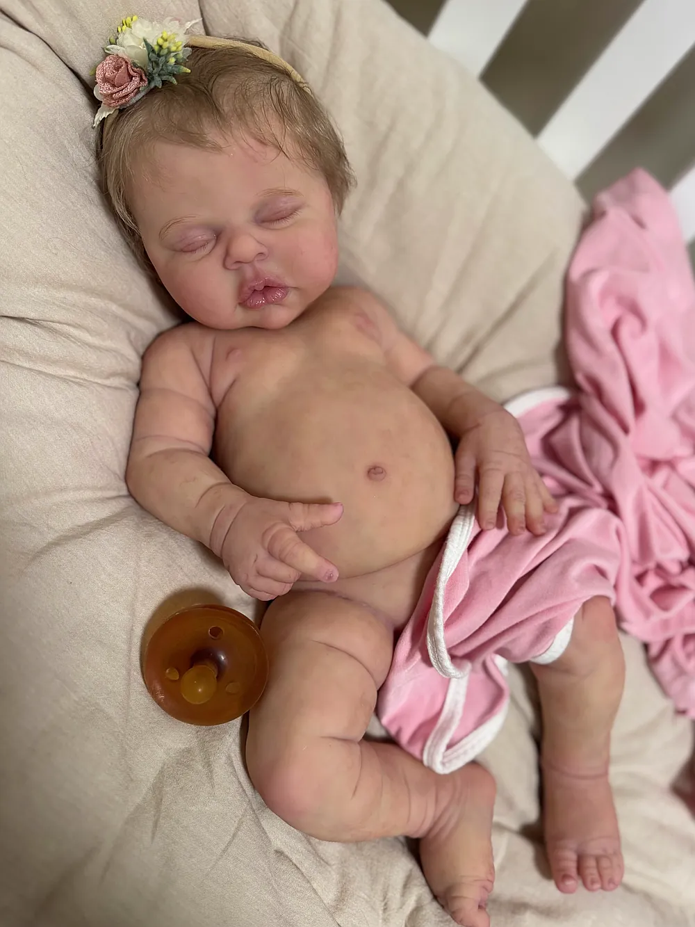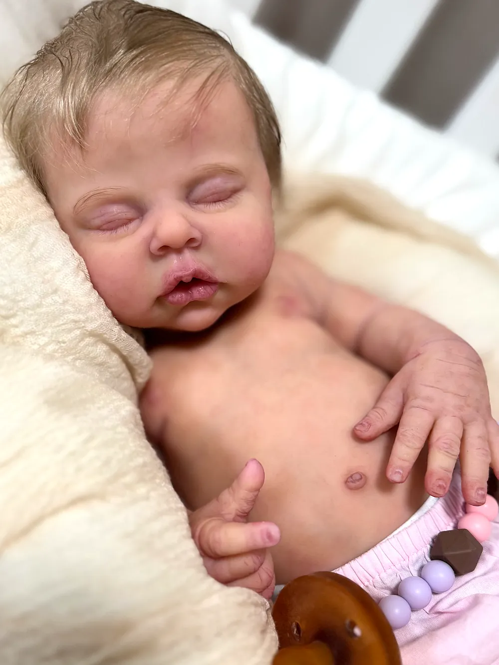 I love chunky babies, and this one does not disappoint. She is made of super soft silicone and is soooo squishy! I just love the rolls on her thighs and her round tummy! She is newborn size, and both preemie and newborn clothes fit her great. She has an open mouth and soft armatures in her arms and legs. She was a dream to paint and root! Her hair is a dark blonde, and it has a slight wave to it that makes styling fun and easy.