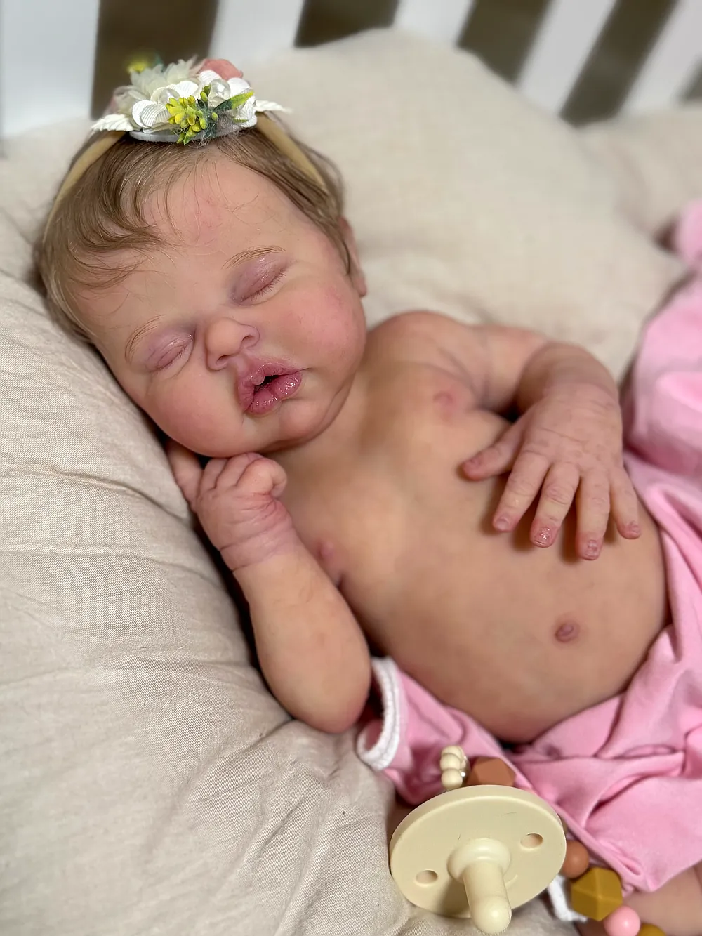 -She has a little mouth so be very careful when using pacifier. Be sure to use a little silicone powder on the pacifier before putting in the mouth.