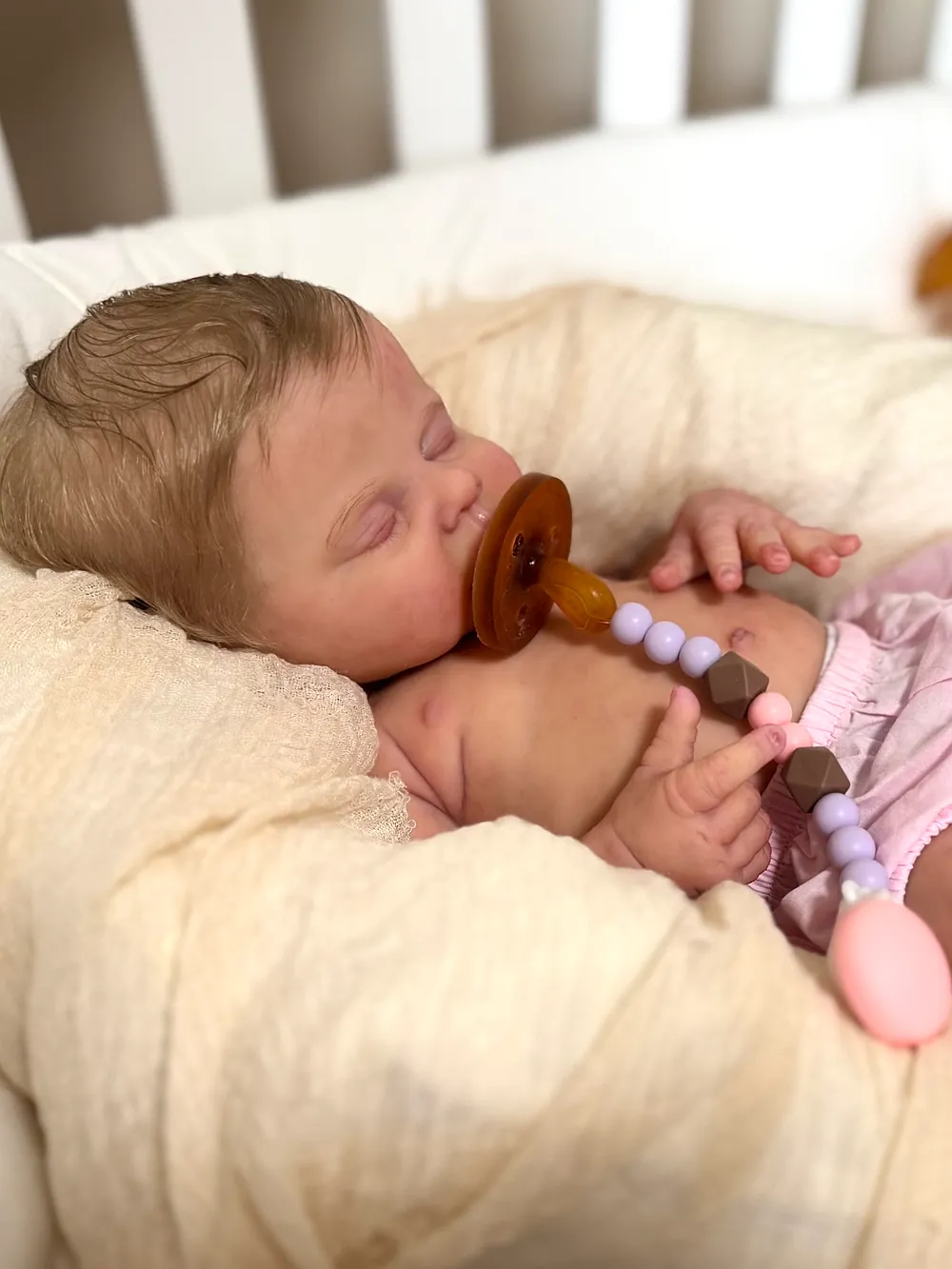 -I made the pacifier clip myself, and it is for doll use only. Do not use it with a real baby as it would be a choking hazard.