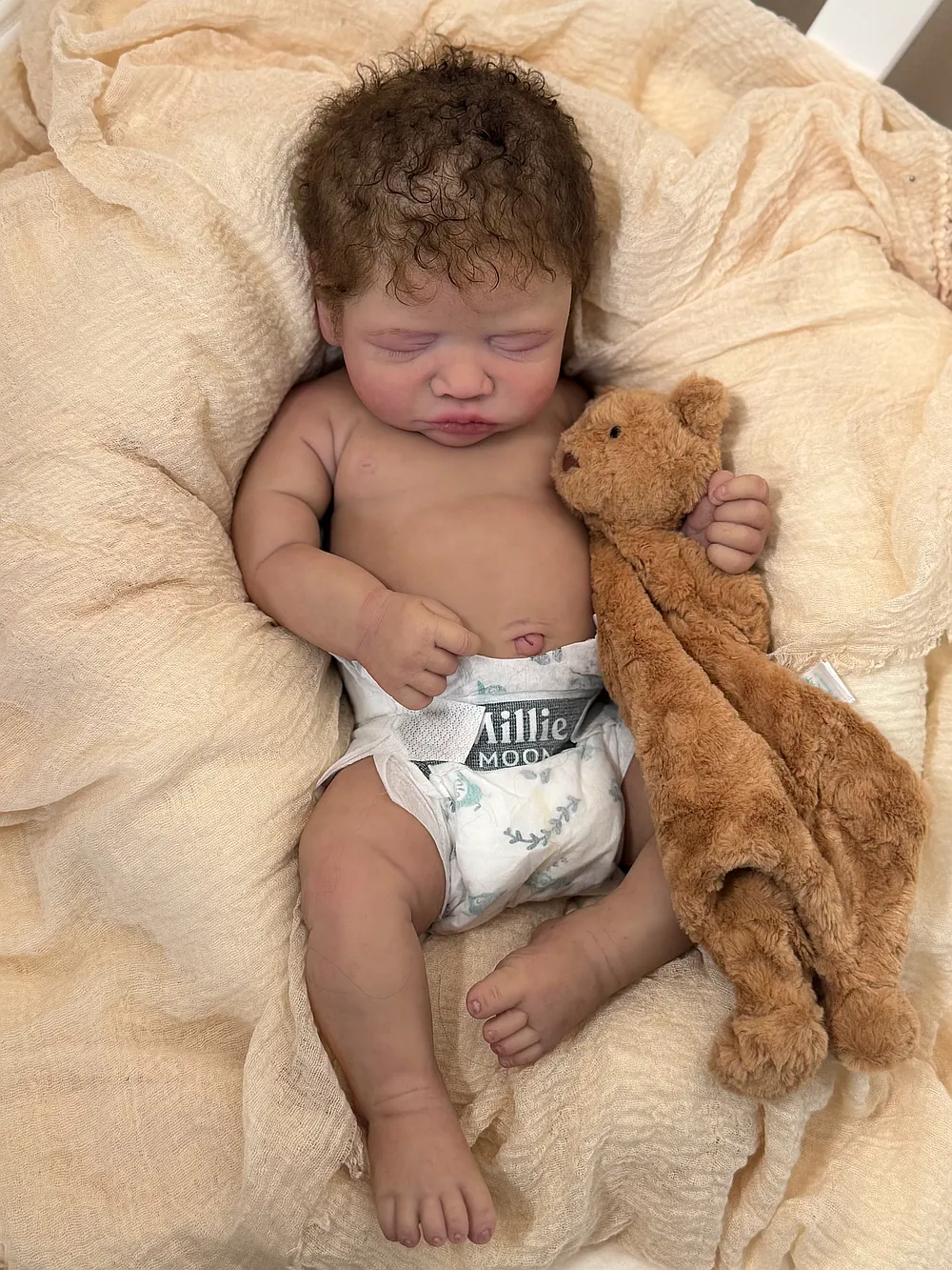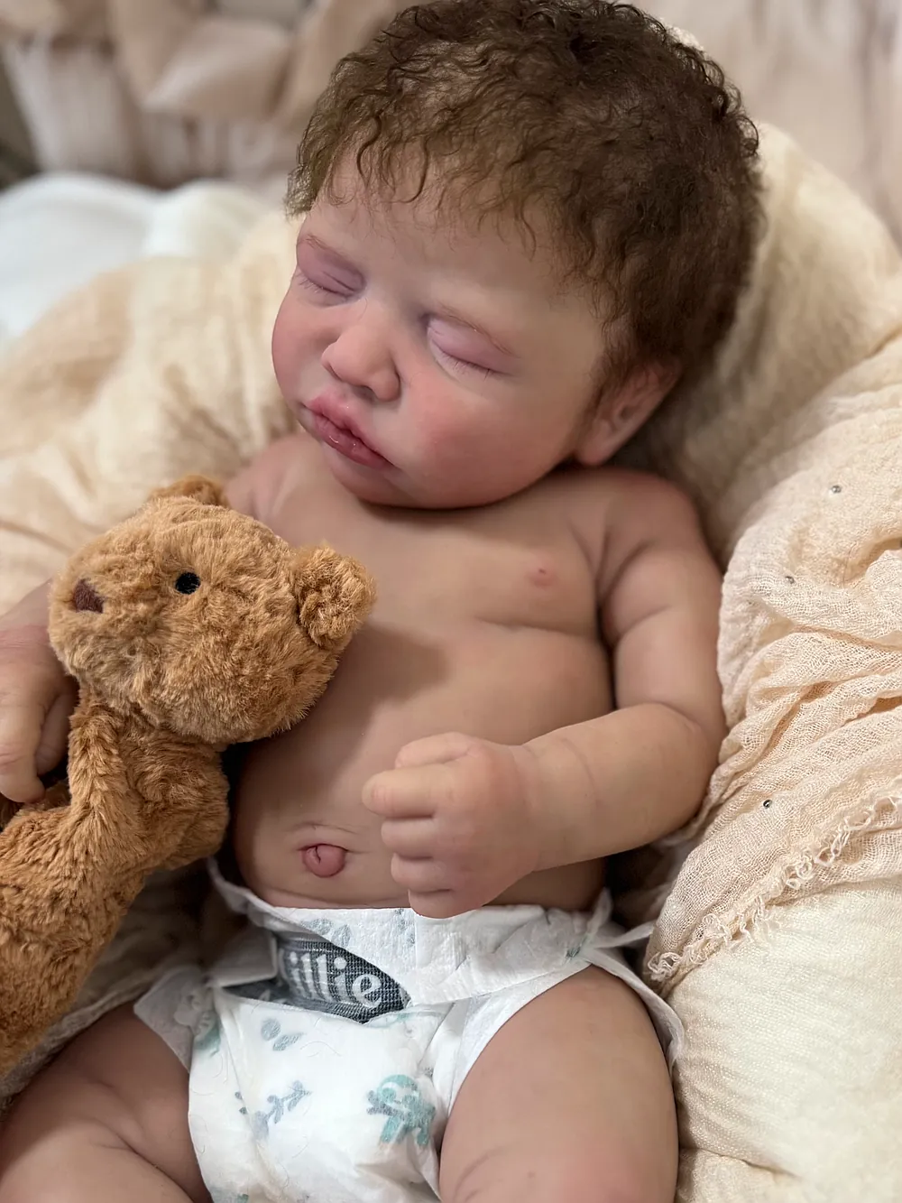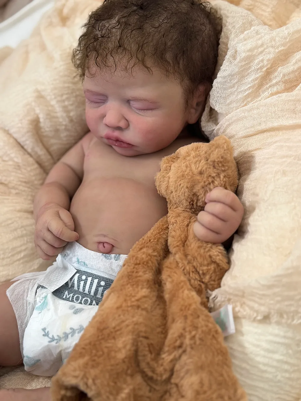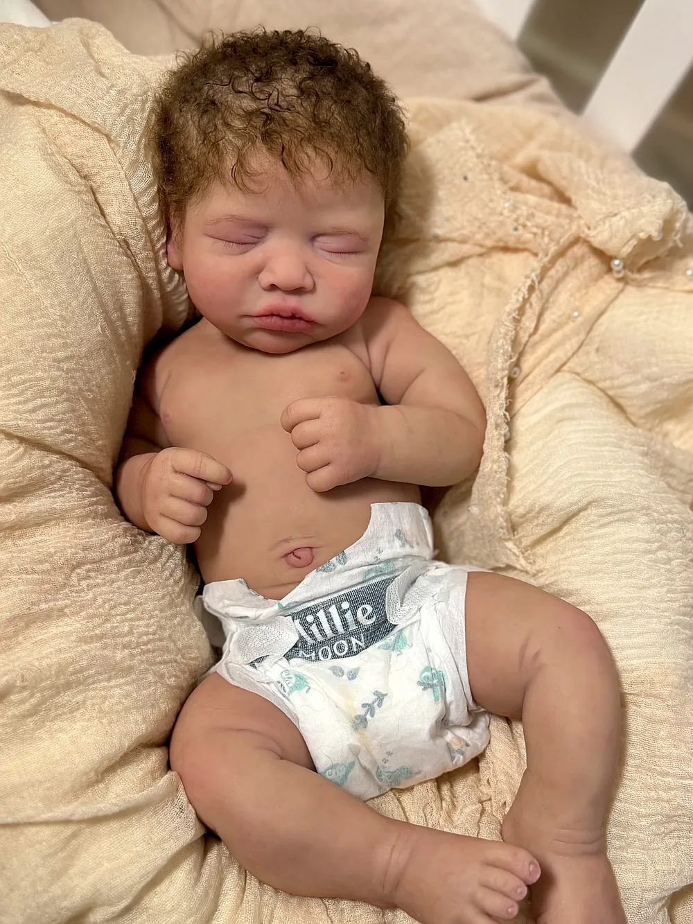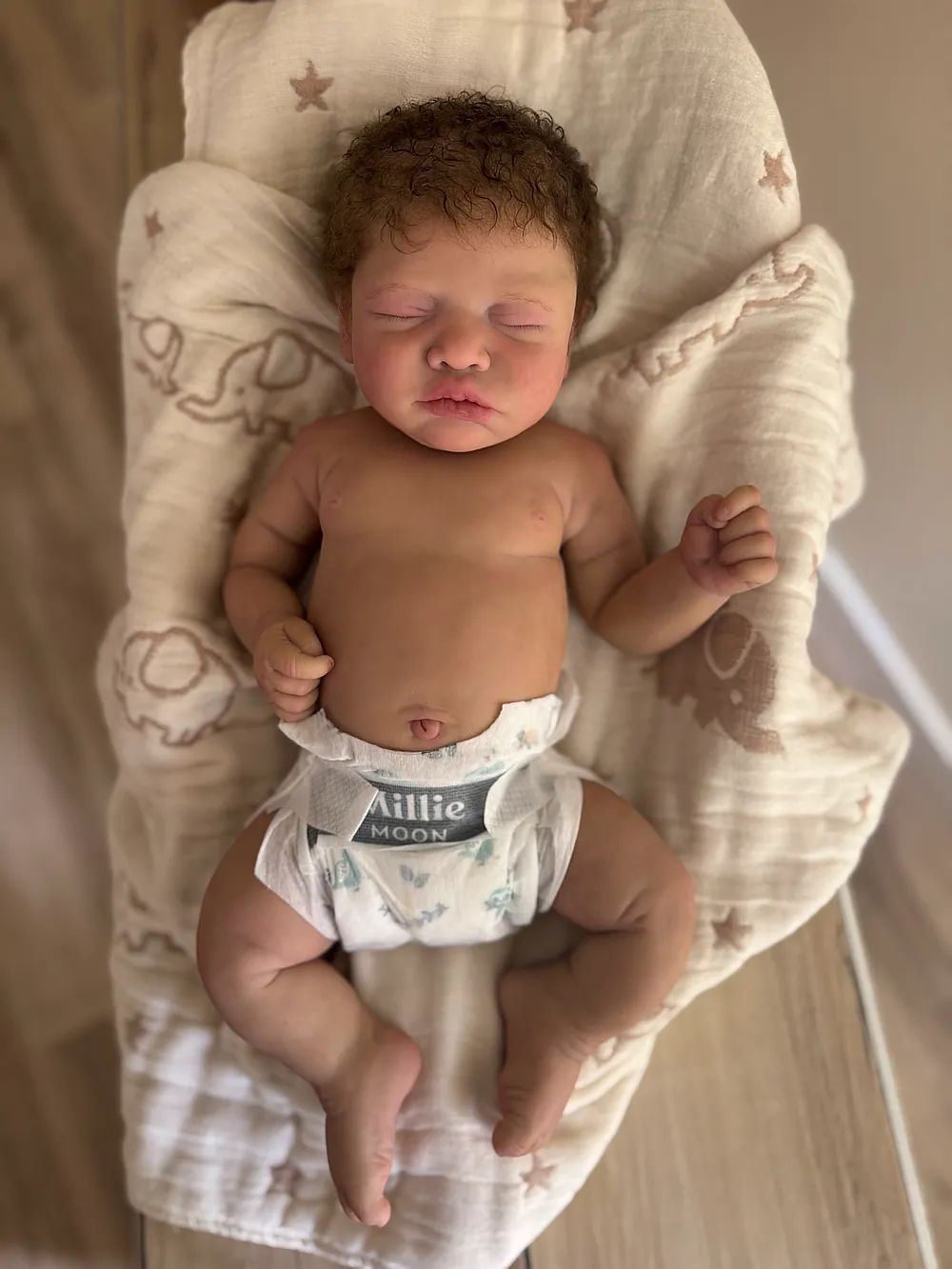 He has an open mouth (mouth is open, but not sculpted inside) that can take a pacifier, and soft armatures in his arms and legs. He is cast in eco20/slacker soft blend silicone and is soooo squishy. He is sealed and matted with silicone velvet matting powder, which makes him oh so soft! He feels like a real baby and just snuggles into you when you hold him. He has a gorgeous biracial skin tone and soft curly dark brown hair. His hair took so long to root, but it was worth every minute:) He fits into newborn, and large preemie-sized clothing.