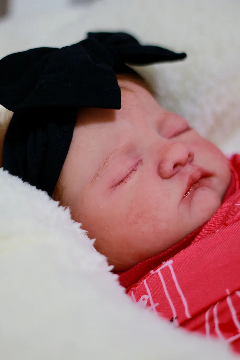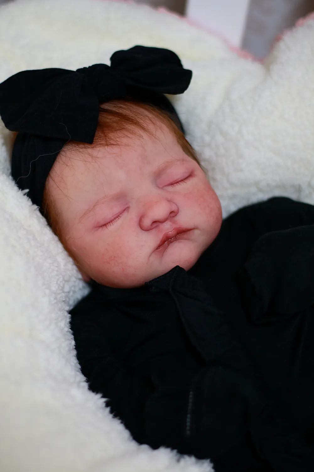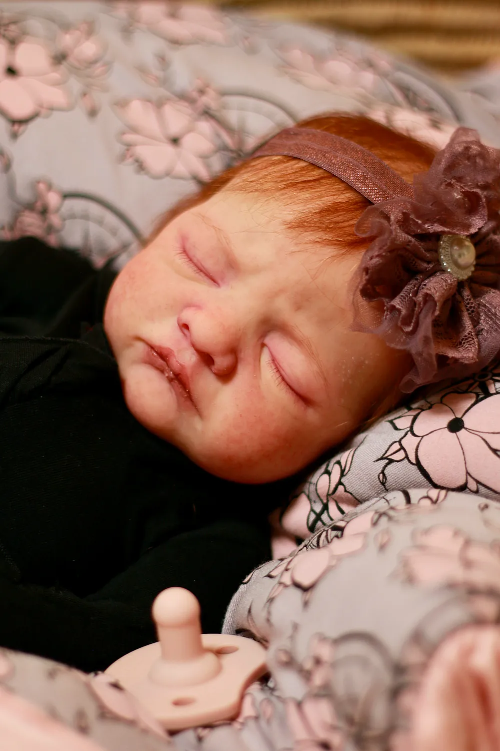 Lucille has been carefully painted with many layers of silicone, sealed, matted, and rooted lovingly by me. She is the first red-headed baby I have made, and I just love the color on her. Her body is made by Crystal’s Stitch Studio and is sooooo soft!