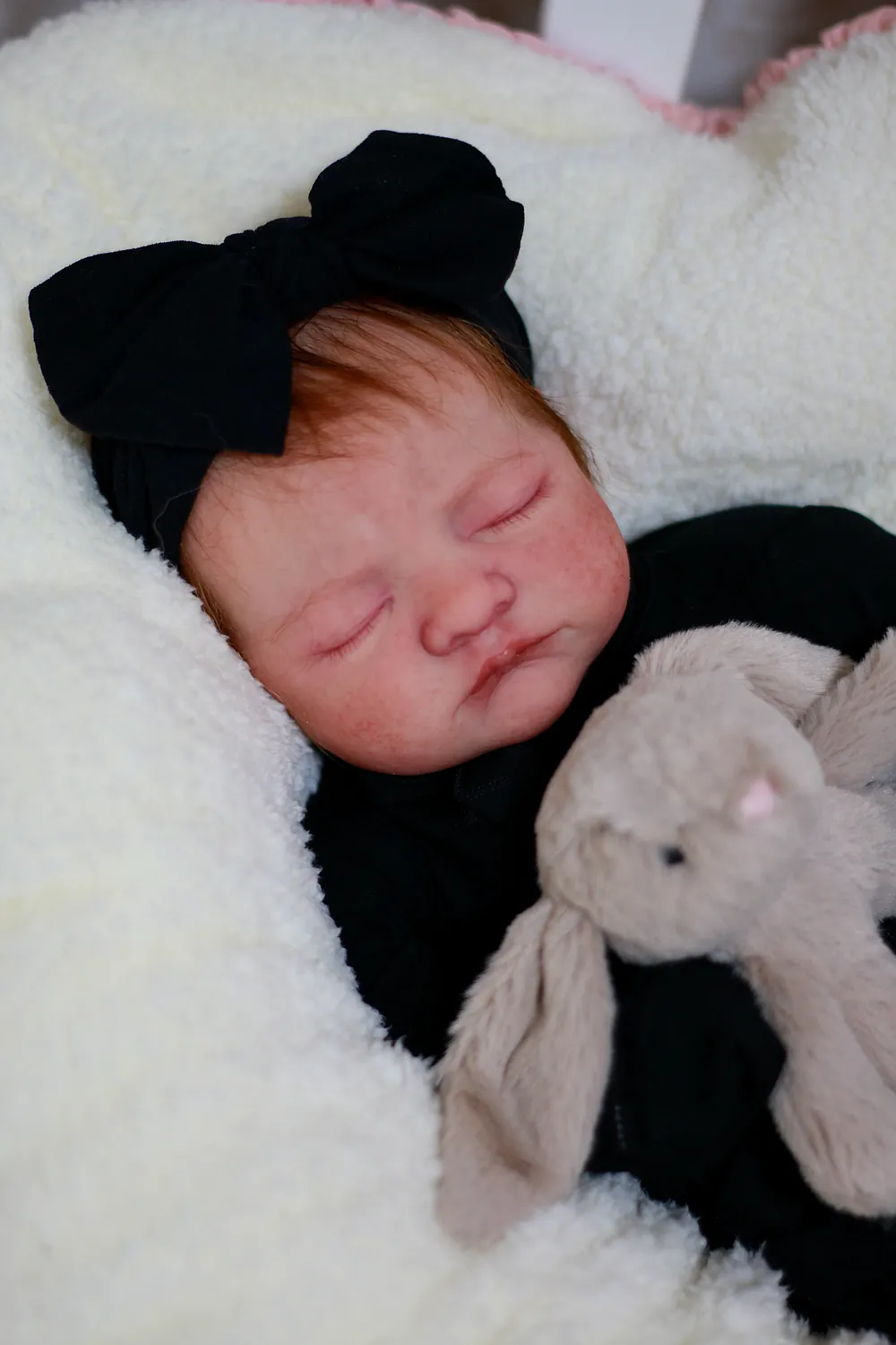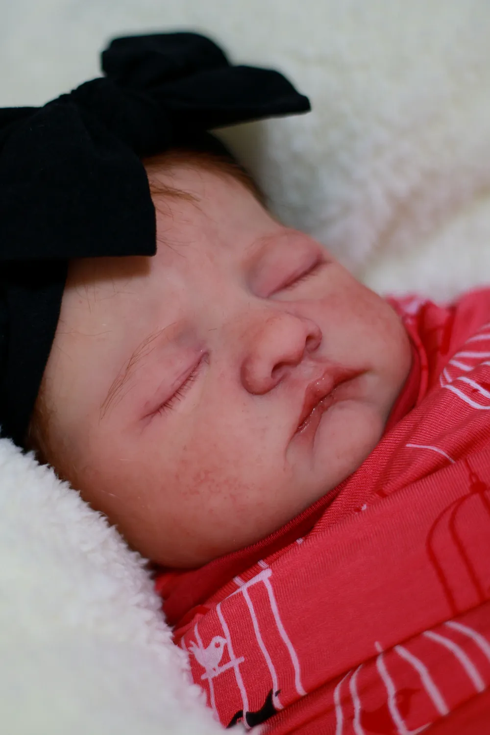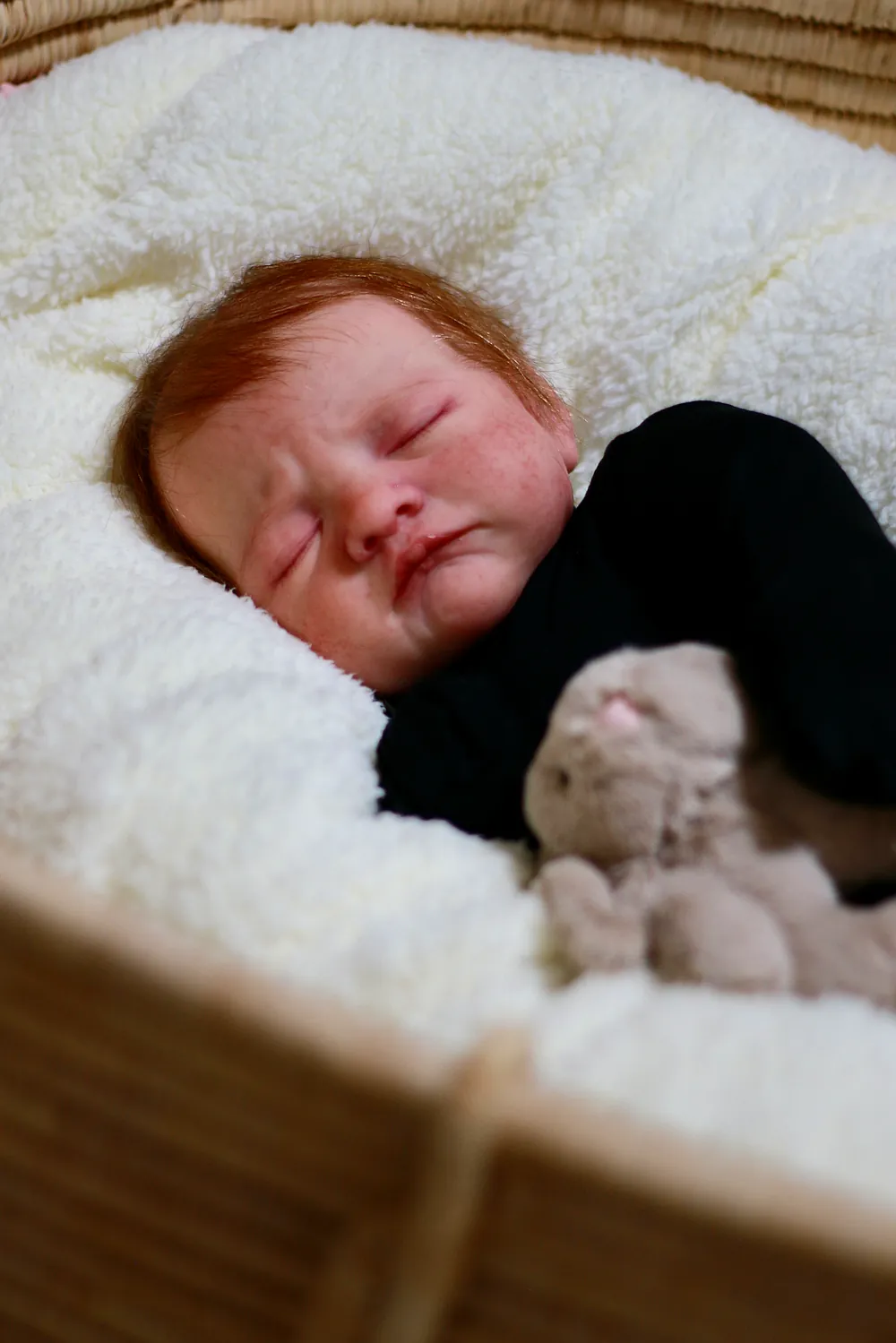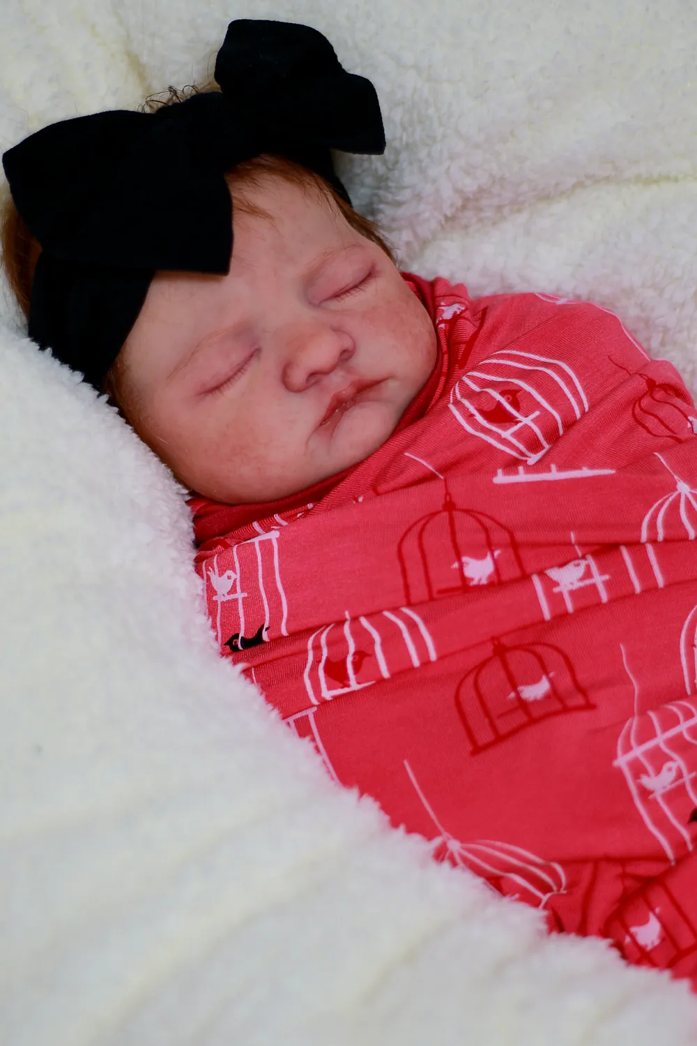 Lucille has been carefully painted with many layers of silicone, sealed, matted, and rooted lovingly by me. She is the first red-headed baby I have made, and I just love the color on her. Her body is made by Crystal’s Stitch Studio and is sooooo soft!