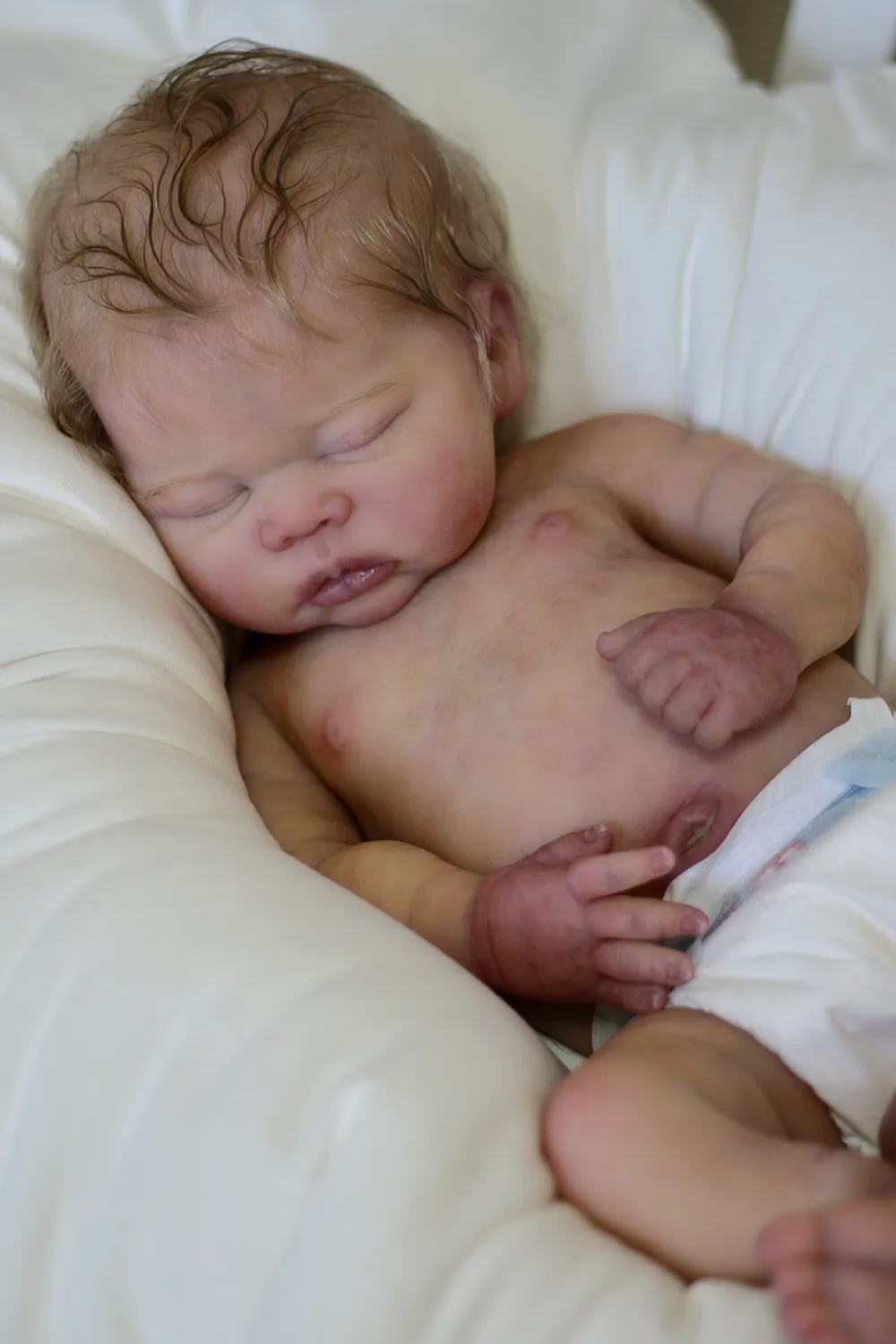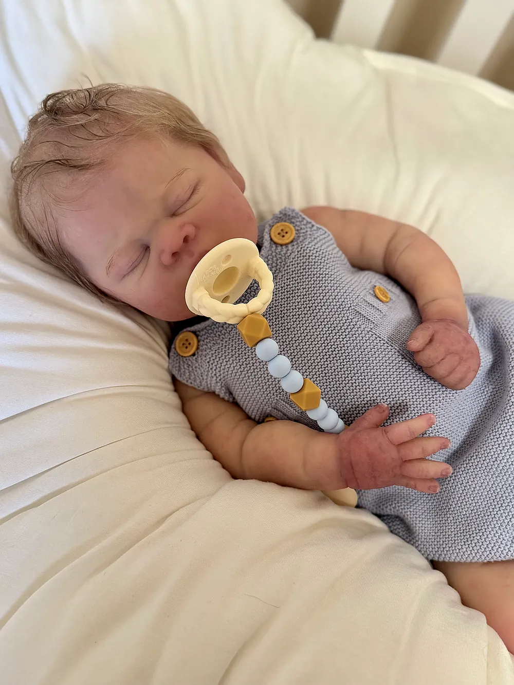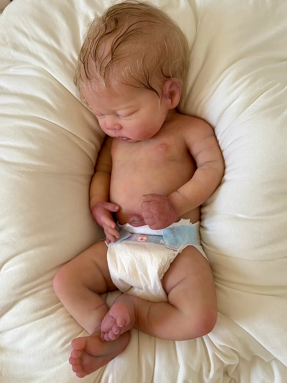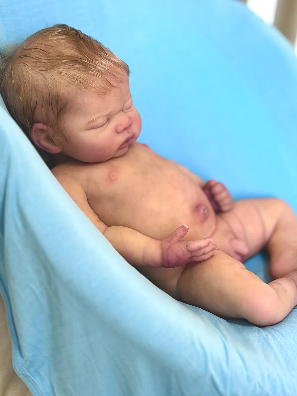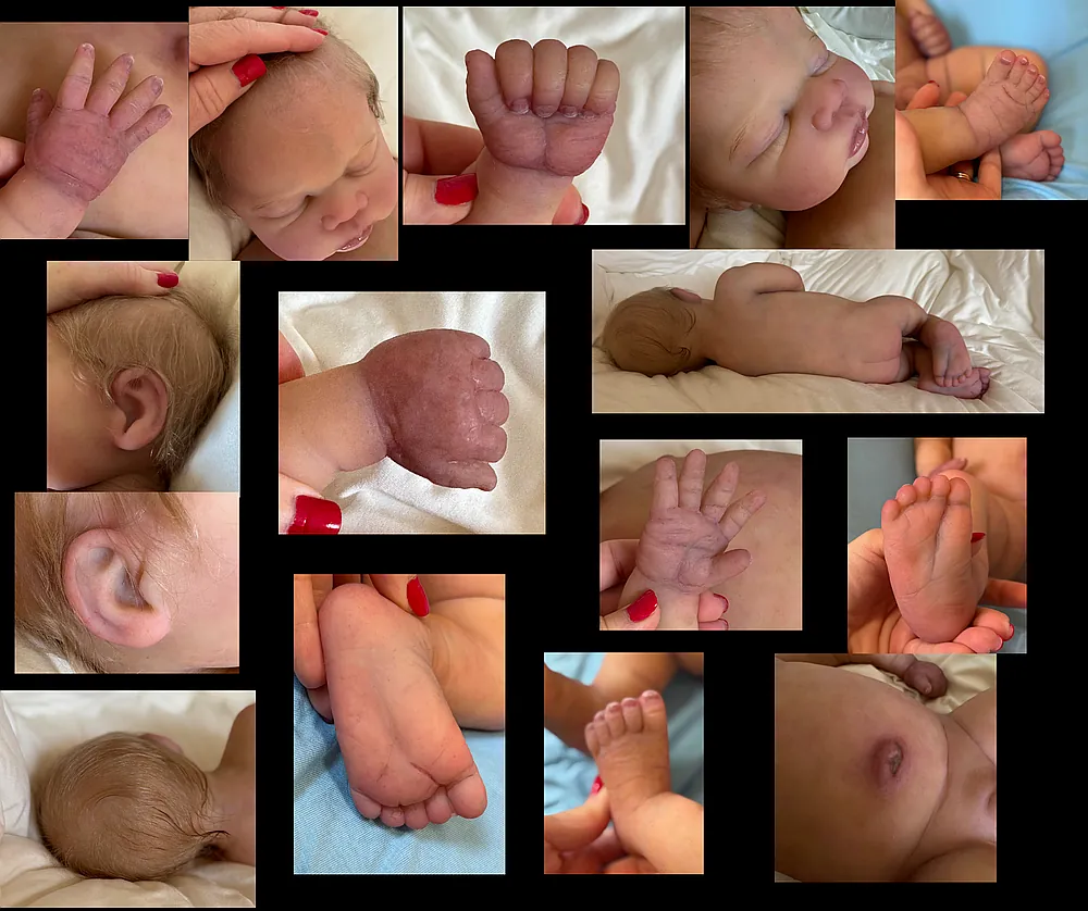 Phoenix is a very BIG baby! He is a full-body silicone boy, sculpted by the amazing Bonnie Sieben. He is sooo cute and is really marshmallow squishy. I think he is the softest baby I have ever painted! Because of this, you must be very careful with his head and support it like you would a real baby. He has armatures in his arms, but you can barely tell, because they are so soft. His hair is rooted with gobaby mohair, which is lovely and easy to style. It is also ethically sourced! It can be straight or wavy, depending on how you style it. He has an open mouth that can take a newborn-sized pacifier that will come with him. His mouth opening is small, so be sure to use silicone powder on the pacifier for easy inserting. I send a sample along with him for pacifier use and touch-ups. He also has a little tongue! He is a very precious little guy, and I just love him.