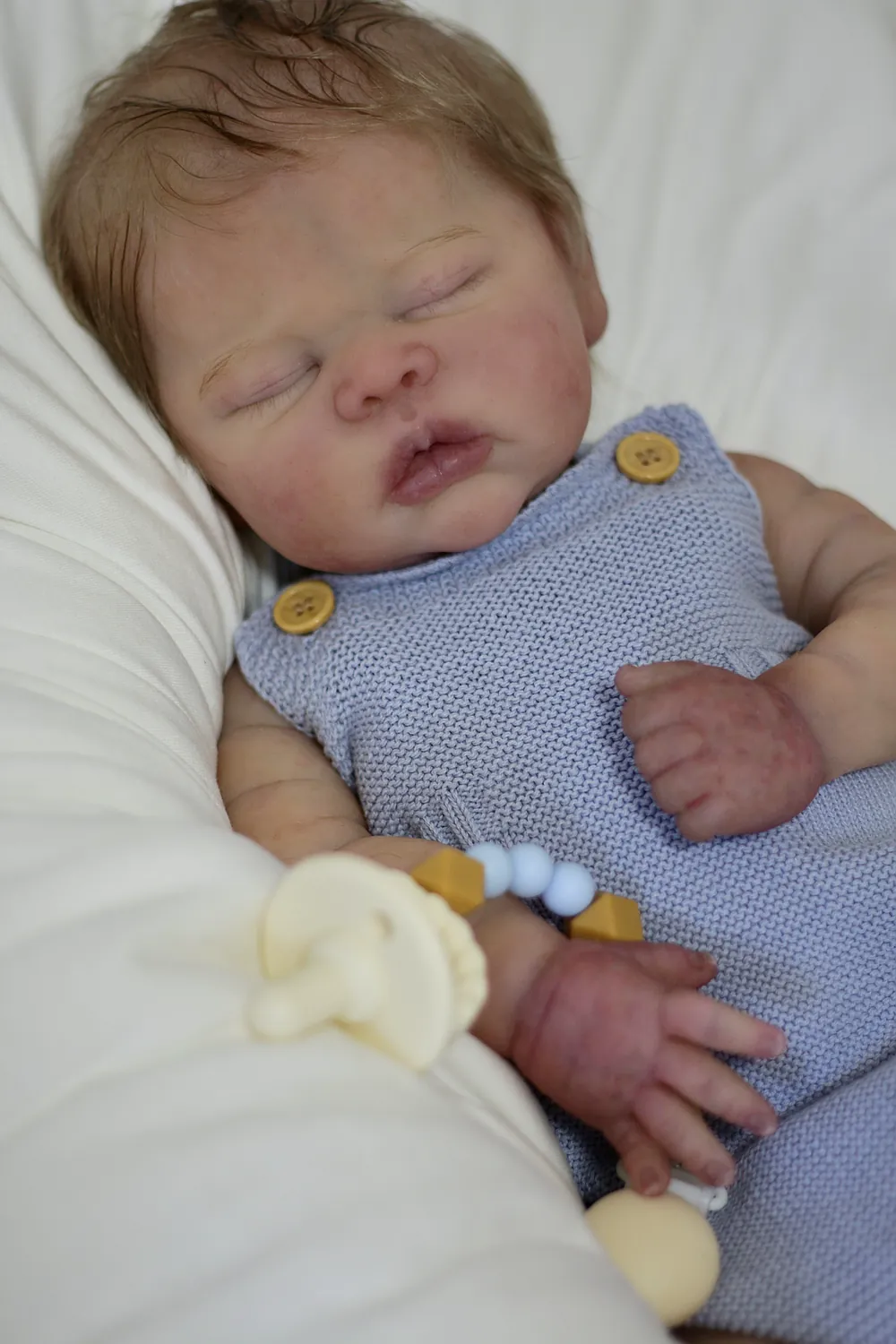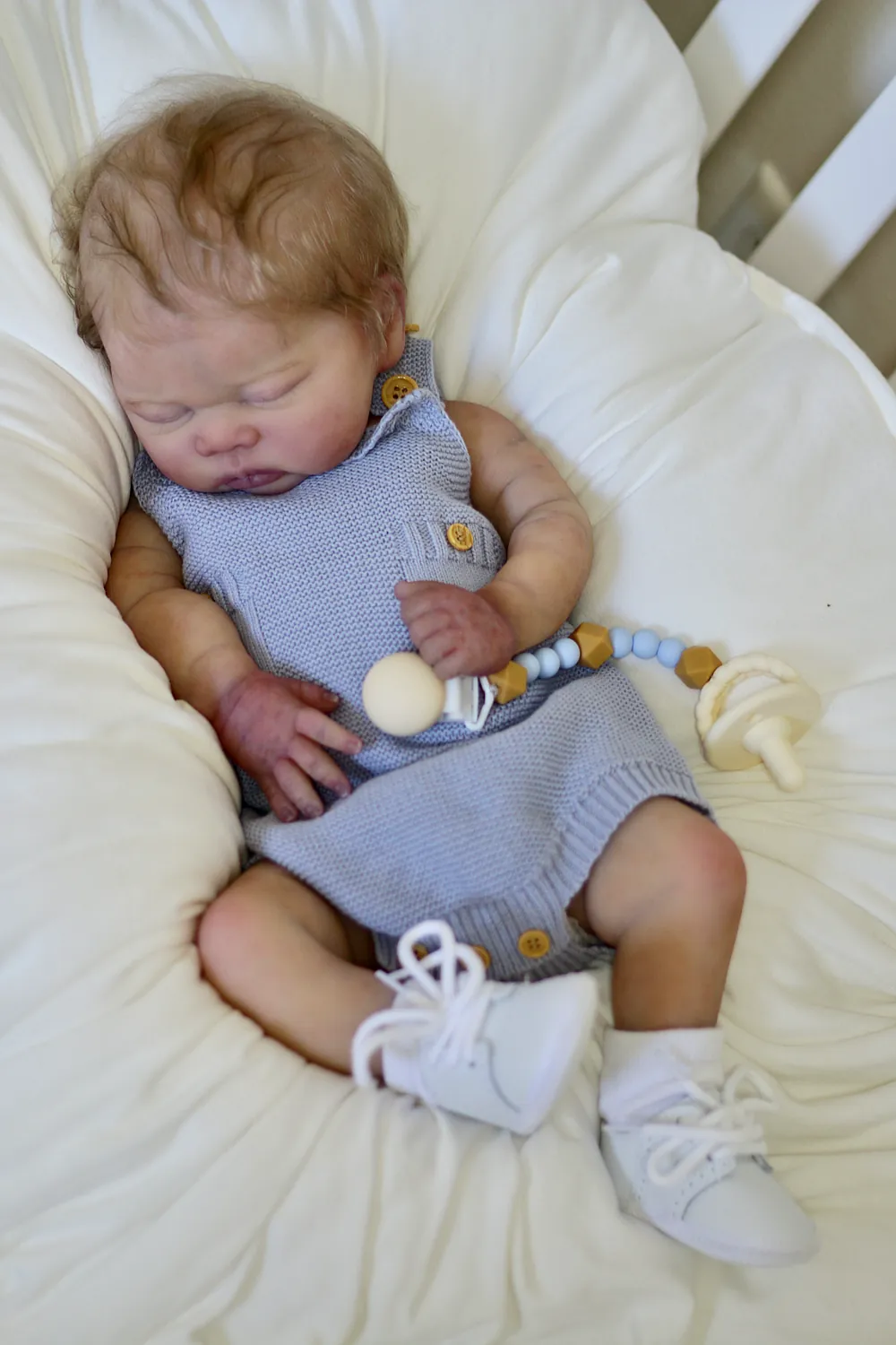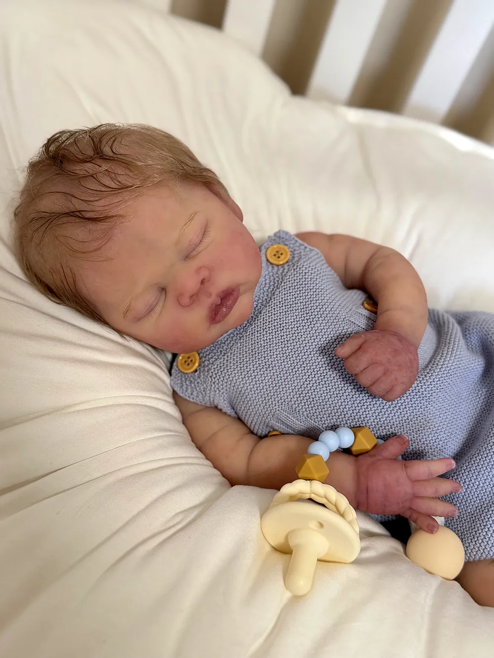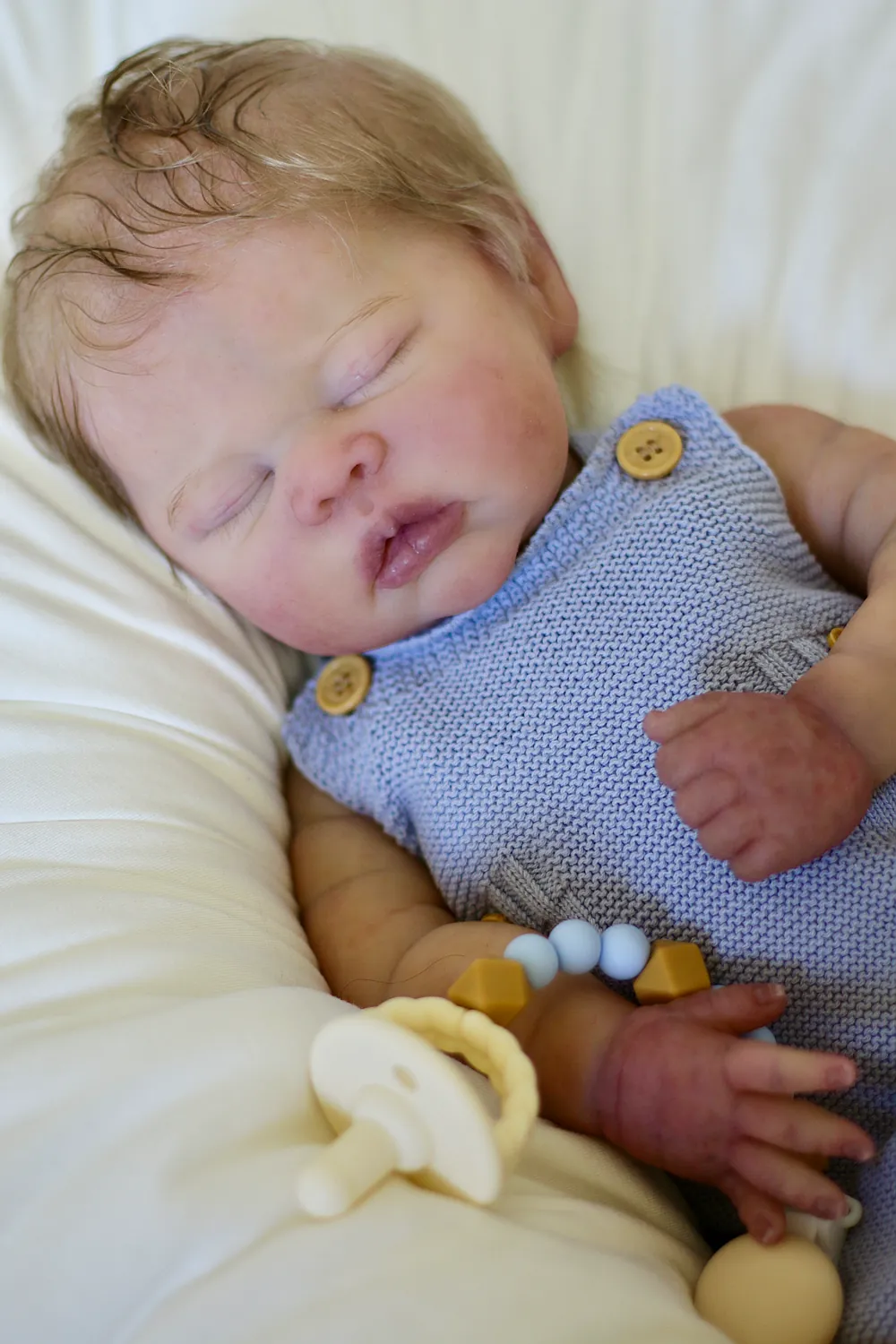Phoenix is a very BIG baby! He is a full-body silicone boy, sculpted by the amazing Bonnie Sieben. He is sooo cute and is really marshmallow squishy. I think he is the softest baby I have ever painted! Because of this, you must be very careful with his head and support it like you would a real baby. He has armatures in his arms, but you can barely tell, because they are so soft. His hair is rooted with gobaby mohair, which is lovely and easy to style. It is also ethically sourced! It can be straight or wavy, depending on how you style it. He has an open mouth that can take a newborn-sized pacifier that will come with him. His mouth opening is small, so be sure to use silicone powder on the pacifier for easy inserting. I send a sample along with him for pacifier use and touch-ups. He also has a little tongue! He is a very precious little guy, and I just love him.